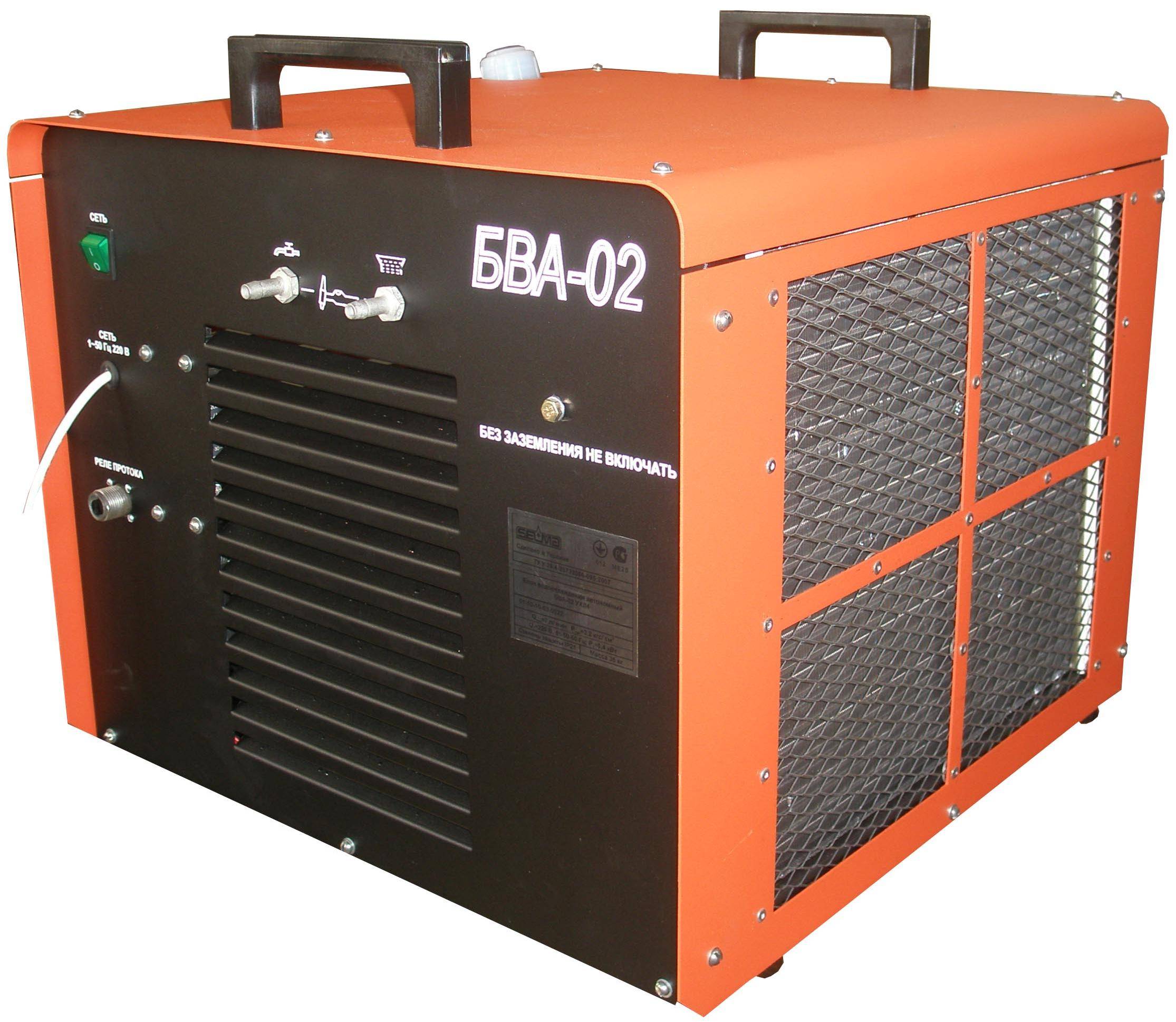 Блок БВА-02 предназначен для охлаждения рабочей жидкости в замкнутой системе, используемой для охлаждения водоохлаждаемых горелок для аргонодуговой и полуавтоматической сварки. В качестве охлаждающей жидкости может использоваться дистиллированная вода или специальные жидкости, кроме коррозионноактивных. Охлаждение рабочей жидкости осуществляется в радиаторе под воздействием воздушного потока.