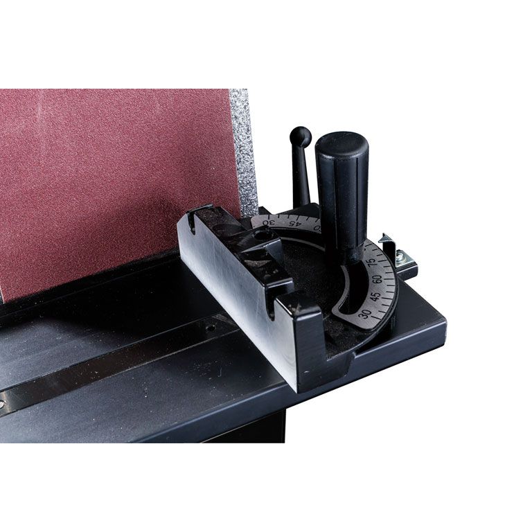 Тарельчато-шлифовальный узел состоит из алюминиевого диска с креплением абразивных листов на «липучке» и чугунного рабочего стола. В его поверхности предусмотрено два перпендикулярных Т-образных паза для работы с угловым упором или устройством для шлифования по кругу. Стол имеет механизм точной регулировки по углу наклона с транспортирной шкалой.