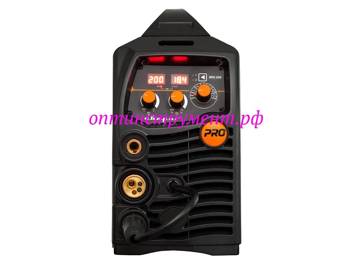 Аппарат серии PRO MIG 200 (N229) предназначен для полуавтоматической сварки в среде защитных газов (MIG/MAG), сварки порошковой проволокой (FCAW), а также ручной дуговой сварки покрытым электродом (ММА) и аргонодуговой сварки (TIG)*.