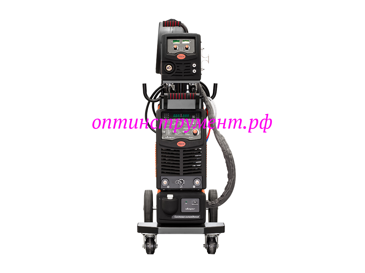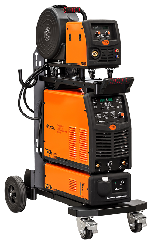TECH MIG 350 P (N316) состоит из выносного подающего механизма, источника питания и блока жидкостного охлаждения. Все оборудование располагается на удобной тележке с площадкой для крепления баллона. Панель подающего механизма оснащена индикаторами тока и напряжения. На блоке кулера расположен индикатор уровня жидкости, а подключение блока производится без дополнительных проводов.
