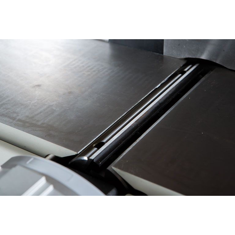 Отличительная особенность новинки – параллелограммный механизм регулировки высоты столов. В сегменте компактного оборудования такая схема получила распространение сравнительно недавно и пока еще более характерна для тяжелого промышленного оборудования. Вместо наклонных скользящих направляющих в ней используются рычаги на осях, нет ни винтов, ни эксцентриков, а усилие от рукоятки прикладывается непосредственно на сторону параллелограмма. Внутреннее трение и люфты в такой конструкции минимальны, что позволяет при настройке перемещать тяжелые столы (регулируются оба: и приемный, и разгрузочный) с наименьшими усилиями и максимально точно.